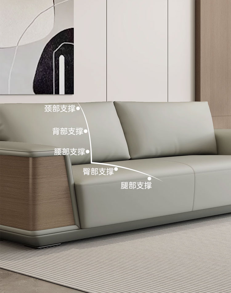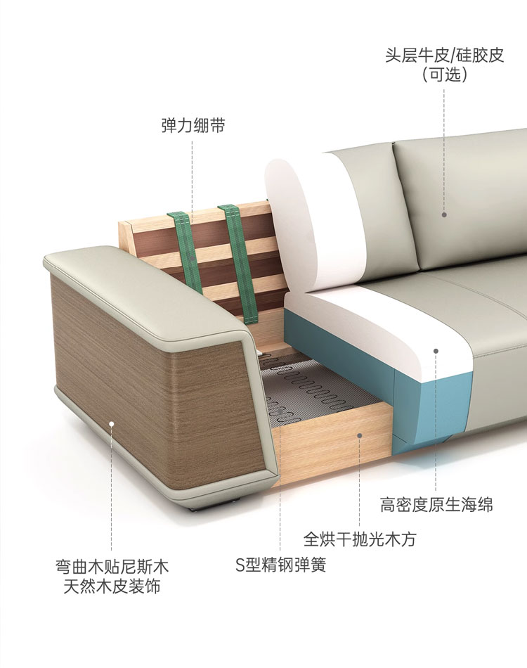 真表层:选用优质意大利“江华”牛皮覆面,厚度1.3-1.5mm,撕裂强求度>35N/mm,断裂伸长率<80%,颜色摩擦牢度>4.5/3.5(干/湿);