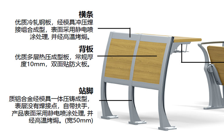 5、写字板机构:固定写字板,采用钢铁支架。写字板基材采用优质密度板面贴防火板,常规厚度25mm,表面贴三聚气胺,写字板尺寸:1025*300*25+5mm