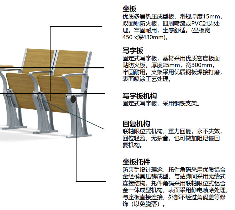 4、背/坐板:优质多层热压成型板,常规厚度10/15mm,双面贴防火板,坐板四周喷漆或PVC封边处理。背板尺寸:445*420*10+5mm,坐板尺寸:445*425*15+5mm